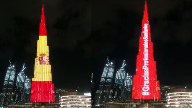 Ahora, y tras el aumento tanto en número de casos confirmados como de fallecidos en España, donde ya se han confirmado más de 17.000 casos y 800 muertos, el Burj Khalifa mira hacia nuestro país. A las 20.00 horas de este jueves, los 828 metros de torre se tornaron de los colores de la bandera española, tal y como ha dado a conocer la Embajada Española en los Emiratos Árabes Unidos a través de su cuenta de Twitter: "El edificio más alto del mundo, el Burj Khalifa de Dubái, rinde homenaje a los profesionales sanitarios en estos momentos difíciles. Gracias Dubái".
