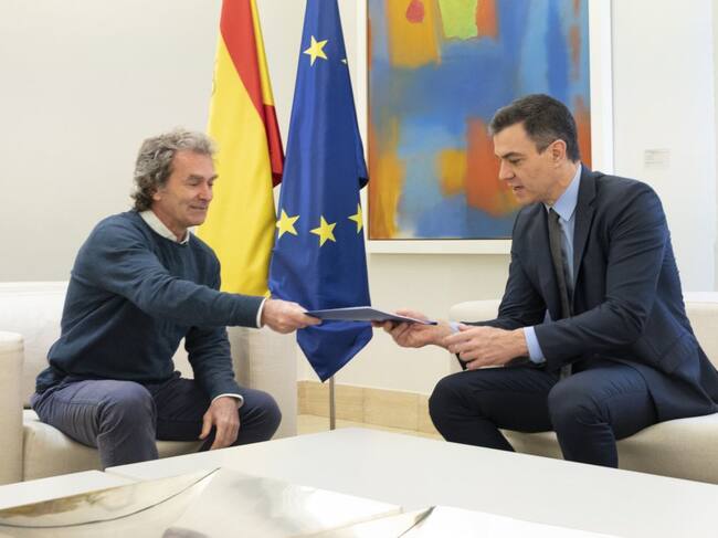 El director del Centro de Coordinación de Alertas y Emergencias Sanitarias del Ministerio de Sanidad, Fernando Simón, entrega al presidente del Gobierno, Pedro Sánchez / Moncloa (EUROPA PRESS)