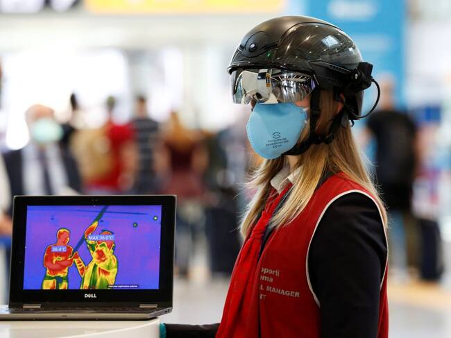 Una oficial del aeropuerto de Fiumicino (Roma) lleva un casco que mide a distancia la temperatura a los pasajeros / REMO CASILLI (Reuters)