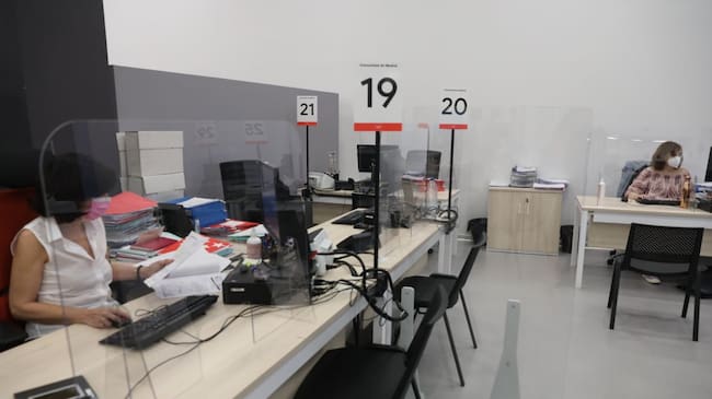Dos trabajadoras de la Oficina del Empleador protegida con mascarilla y con una pantalla separadora en su mesa. / Marta Fernández Jara (EUROPA PRESS)