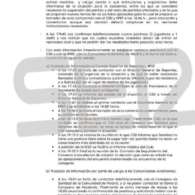 LaLiga ha insistido en su informe que siguió el protocolo sanitario. Es decir, aislar al positivo y apartar al resto. En un tono irónico, ha subrayado que el CSD “no conoce su propio protocolo” y ha remarcado que la comunicación fue fluida con la Federación y el CSD. Por último, LaLiga también ha dicho que es el laboratorio quien debe comunicar los positivos a los gobiernos autonómicos.