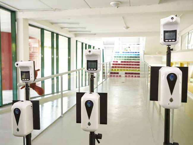 Dispensador de gel hidroalcohólico y medidor de temperatura, mecanismo que constituyen parte del protocolo anticovid para la 'vuelta al cole' en el Colegio San Pelayo en Ermua (Bizkaia). / Ion Alcoba - Europa Press (EUROPA PRESS)