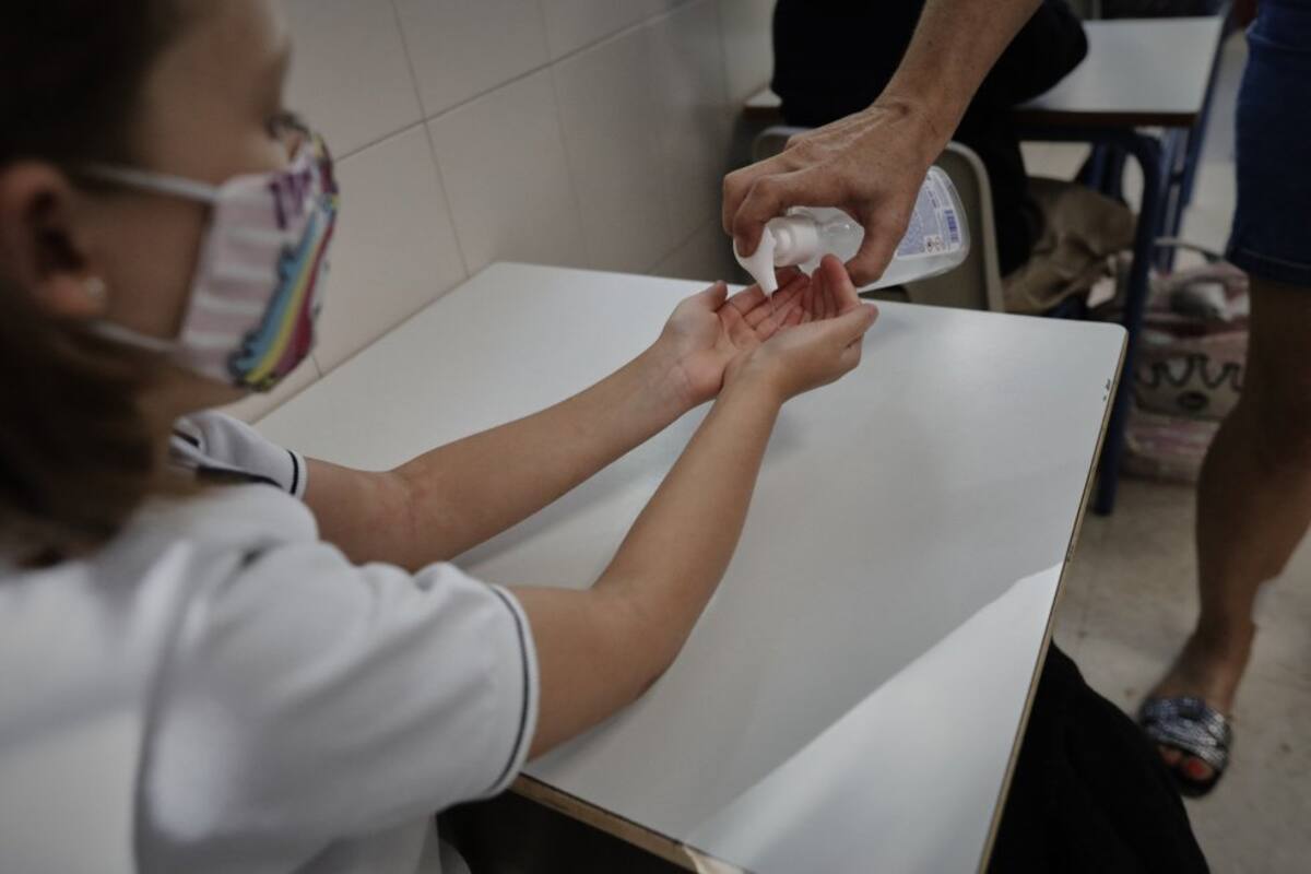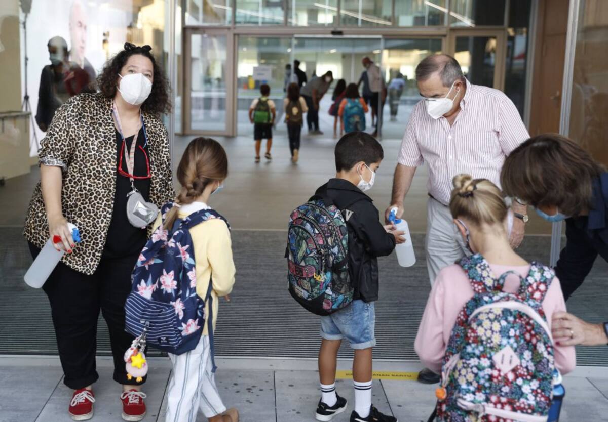 Personal del colegio Aldapeta María Ikastetxea aplica este lunes gel hidroalcohólico a los alumnos. Los alumnos vascos hasta segundo de la ESO vuelven hoy a las aulas entre medidas preventivas para evitar el contagio de la covid-19, en un arranque atípico