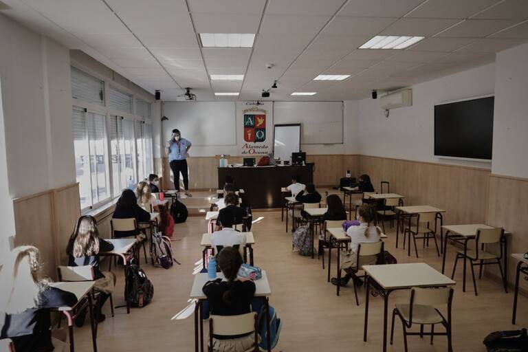 Niños en las aulas del Colegio Privado Alameda de Osuna en el primer día del curso escolar 2020-2021, en Madrid (España).