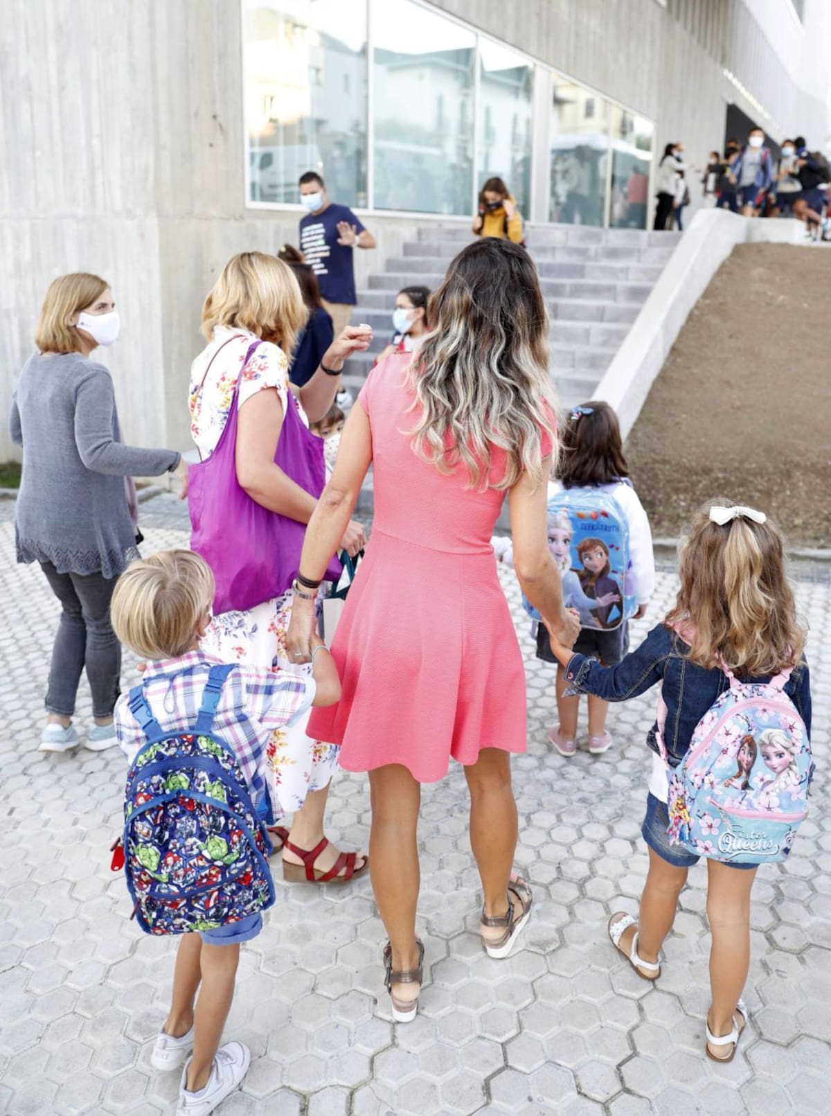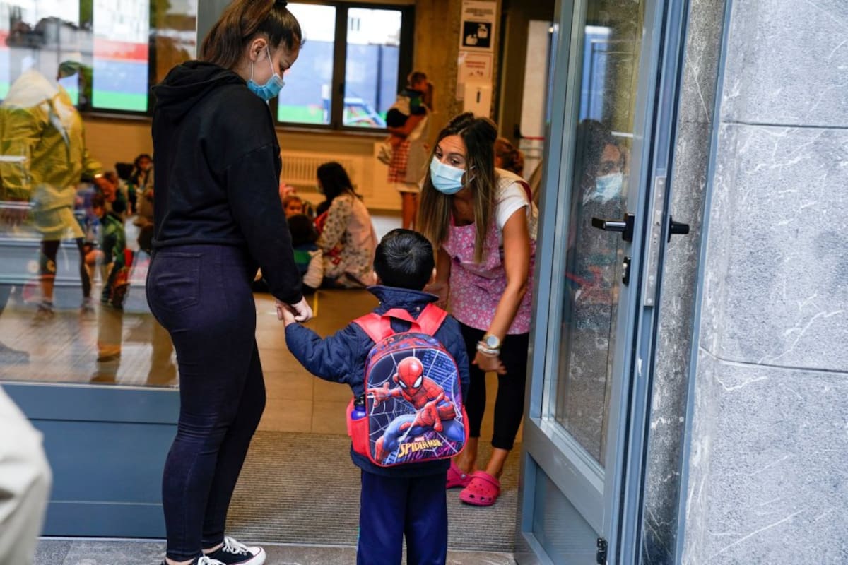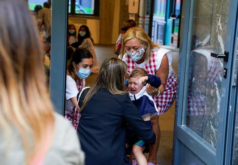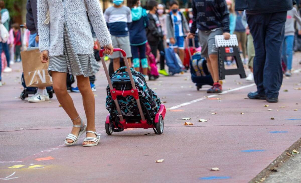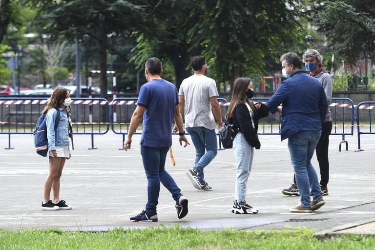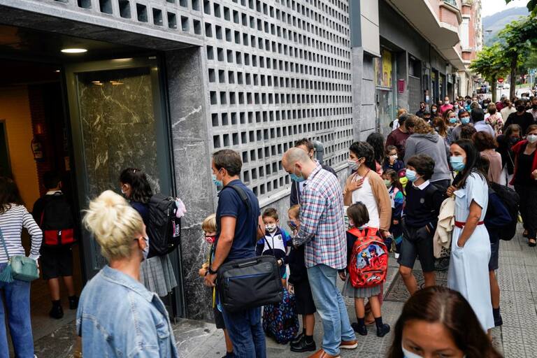 Varios niños acuden este lunes al colegio Aldapeta María Ikastetxea. Los alumnos vascos hasta segundo de la ESO vuelven hoy a las aulas entre medidas preventivas para evitar el contagio de la covid-19, en un arranque atípico del nuevo curso escolar donde