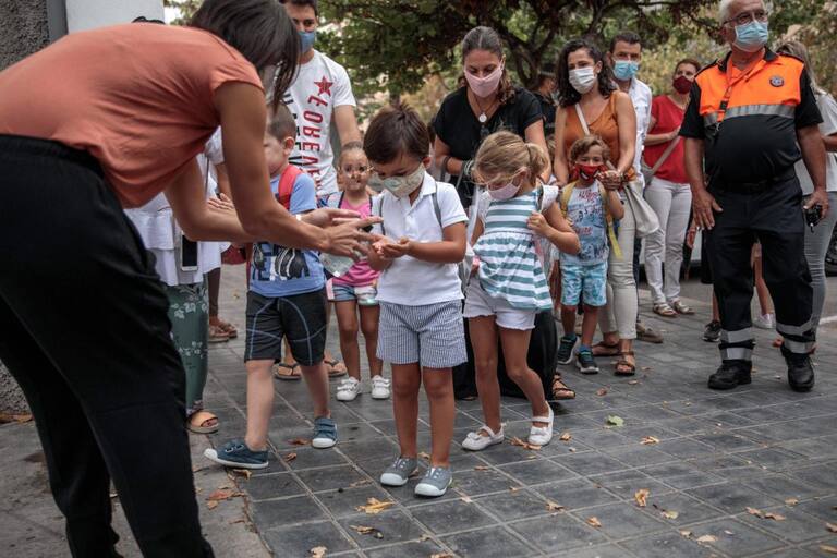 El alumnado del colegio Jesús y María de Valencia se aplica gel desinfectante, durante el primer día de clase para 794.243 alumnos y 4.374 profesores de 1.425 centros públicos y 420 concertados de la Comunitat Valenciana en un "excepcional" inicio de curs