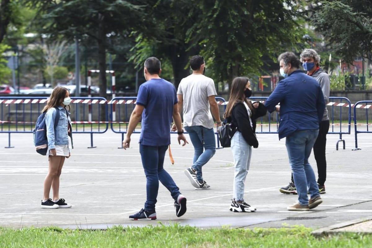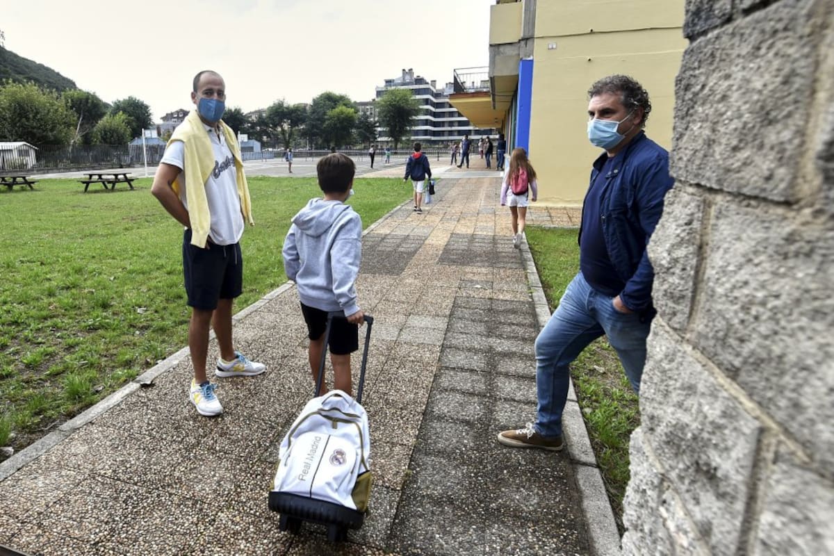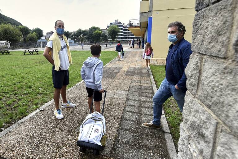 Varios alumnos y sus padres acuden al CEIP. R.Macías Picavea en el primer día del curso escolar 2020-2021, en Santoña (Cantabria), a 7 de septiembre de 2020.