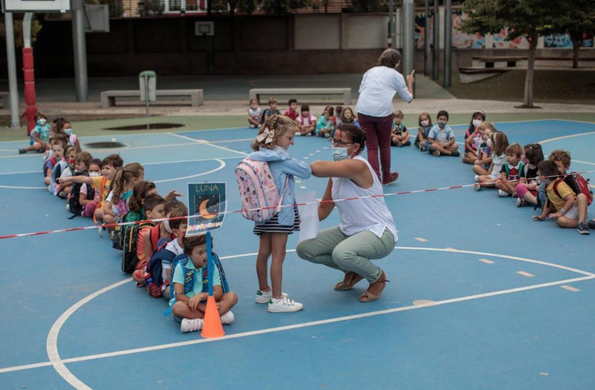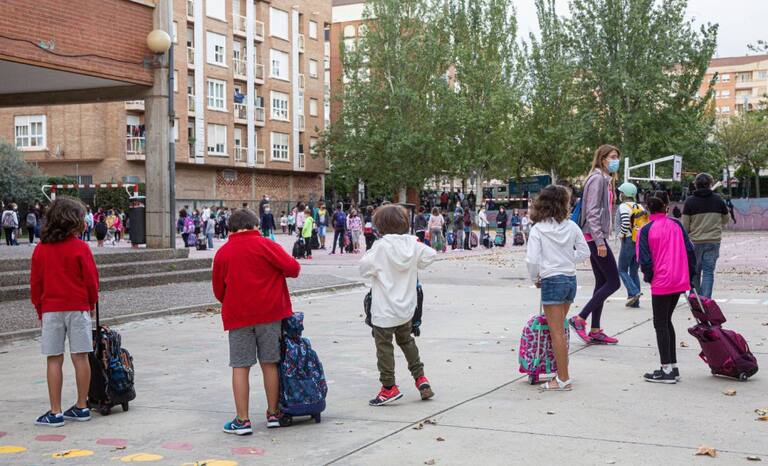 Alumnos del colegio público de Las Gaunas de Logroño esperan su turno para entrar a la entrada del centro durante el primer día del curso escolar este lunes.