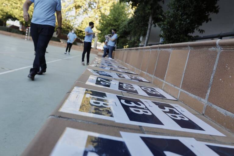 Indicadores de curso en el Colegio Privado Alameda de Osuna en el primer día del curso escolar 2020-2021, en Madrid (España).