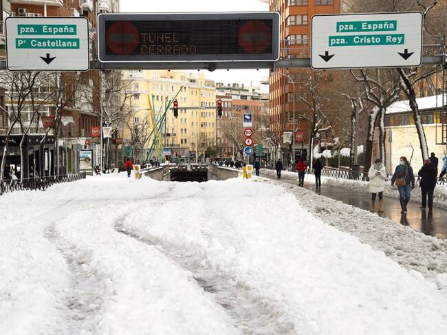 Acceso cubierto de nieve a un túnel urbano en Madrid que continúa cerrado tras el paso del temporal Filomena. / Ballesteros (EFE)