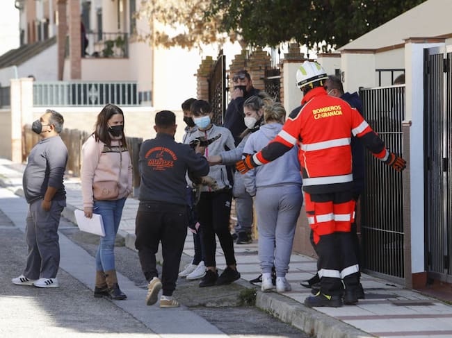Un bombero atiende a varios vecinos tras el terremoto de 4.4 grados con epicentro en Santa Fe, que ha dejado numerosos daños materiales en varias viviendas de la localidad de Atarfe. / Álex Cámara (EUROPA PRESS)
