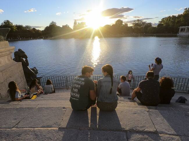 Una pareja conversa con las mascarillas puestas en el parque del Retiro de Madrid / GETTY IMAGES