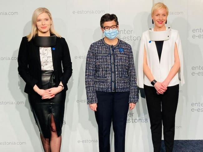 La visita a Estonia de la ministra de Exteriores, Arancha González Laya, ha hecho viral una imagen chocante. La representante española se protege con una mascarilla quirúrgica mientras dos empleadas de un centro de investigación tecnológica de Tallin tienen sus rostros descubiertos y mantienen sobre sus hombros una especie de collarín. ¿Por qué no llevan mascarillas? ¿Qué es ese aparato?