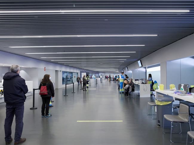 Varias personas hacen cola en las inmediaciones del Wanda Metropolitano para en el dispositivo puesto en marcha en las instalaciones del Wanda Metropolitano, a 16 de abril de 2021. / Jesús Hellín (EUROPA PRESS)