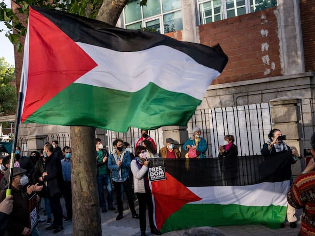 Un grupo de manifestantes ondea la bandera palestina en una protesta frente a la embajada de Israel en Madrid, el pasado 29 de abril, para protestar por la detención de la española Juana Ruiz. / DPA vía Europa Press (DPA vía Europa Press)
