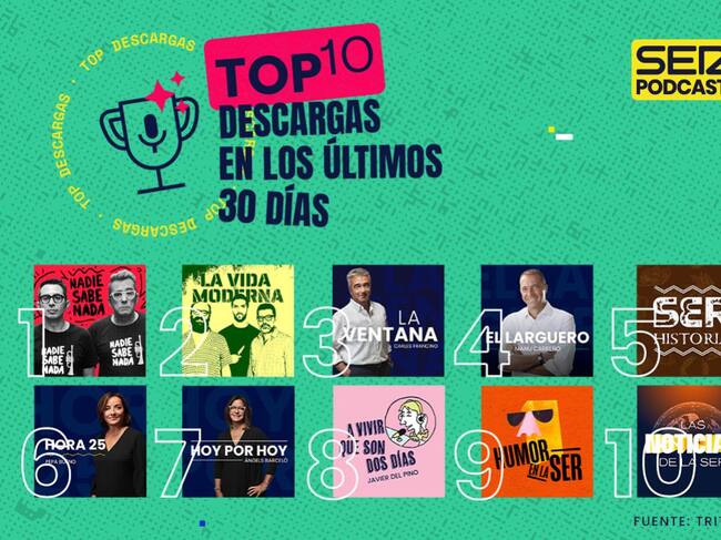 El gran número de descargas muestra también el interés en la oferta de podcast ofrecida por SER PODCAST. Los usuarios elijen cuales son sus podcasts favoritos. A la cabeza del Top Ten, estarían Andreu Buenafuente y Berto Romero con Nadie Sabe Nada. En segunda posición se coloca La Vida Moderna de David Broncano, Ignatius y Quequé. El tercer lugar es para La Ventana de Carles Francino. Le sigue, en cuarta posición, El Larguero de Manu Carreño. En quinta posición encontramos a Nacho Ares y su SER Historia seguido de Hora 25, de Pepa Bueno; Hoy por Hoy, con Àngels Barceló, y del programa de Javier del Pino, A vivir. Completan este ranking, Humor en la SER y Las Noticias de la SER.