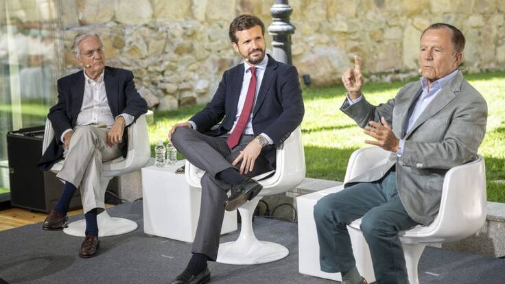 El presidente del PP, Pablo Casado, participa en Ávila en el acto 'Concordia, Constitución y patriotismo' junto con los exministros Arias Salgado y Camuñas para criticar la nueva ley de Memoria Democrática que va a aprobar el Gobierno.