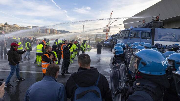 Algunos manifestantes se enfrentaron esta tarde con fuerzas antidisturbios de la Policía en el puerto italiano de Trieste (noreste), con gritos y lanzamiento de petardos, después de que esta mañana los agentes disolvieran con agua a presión su protesta contra la obligación del certificado contra la COVID-19 para trabajar.