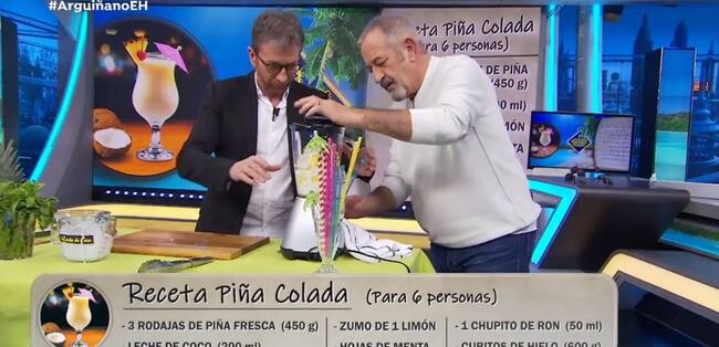 La receta es sencilla pero, cosas del directo, la batidora que el programa había facilitado al cocinero dio algunos problemas... "Trata de arrancarlo...", bromeaban los colaboradores... "Hay que cambiar de marca"... sentenciaba Arguiñano. Hasta Pablo Motos trató de arreglar el electrodoméstico pero no había manera de que los ingredientes de la receta se fusionaran.