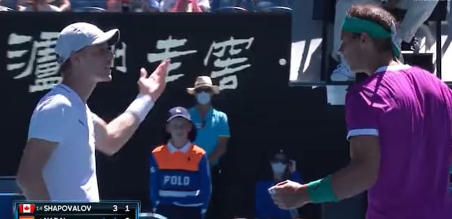 Nadal y Shapovalov discuten en un momento del partido / Captura