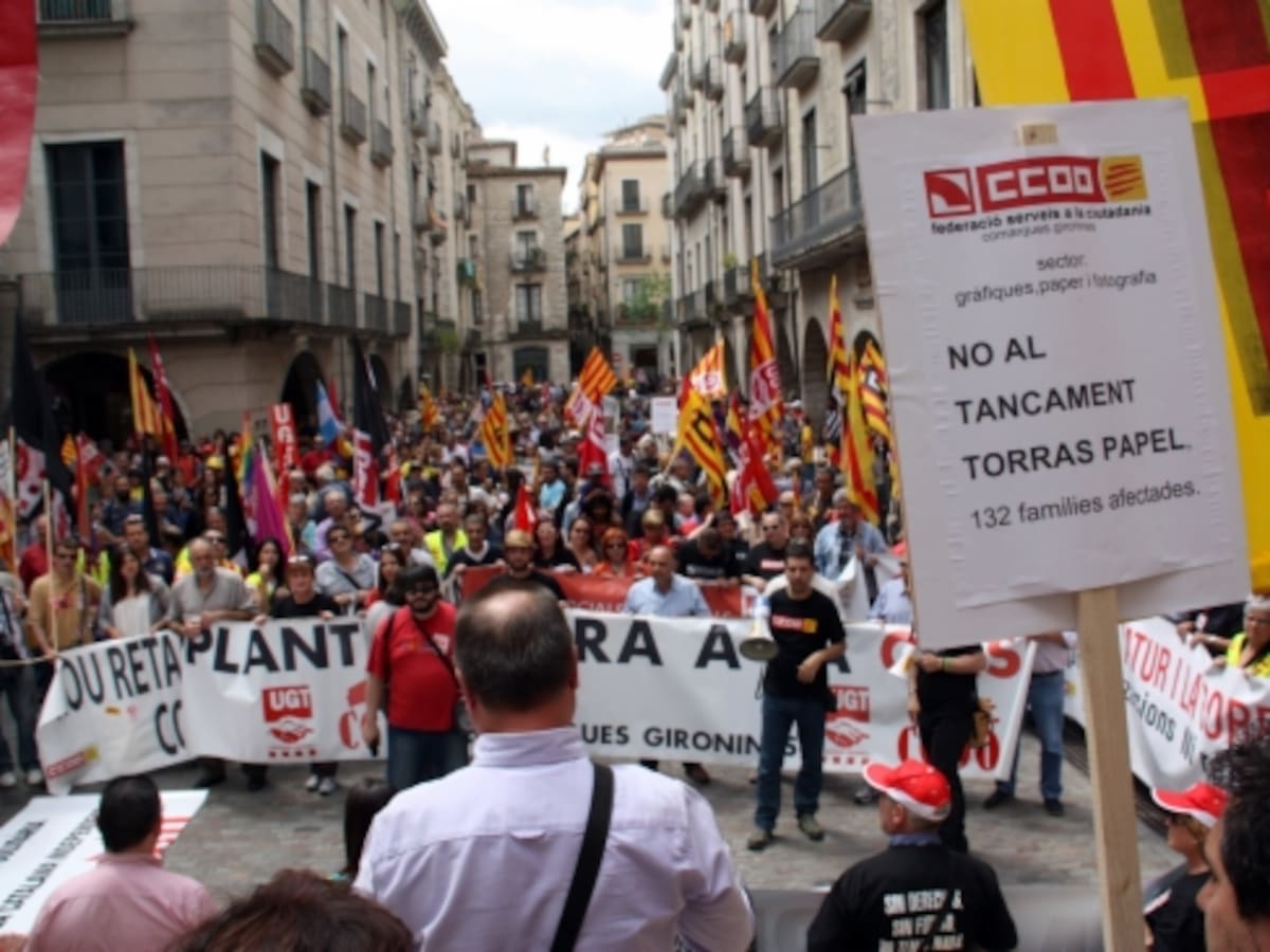 Unes 2.500 persones es van manifestar pels carrers de Girona el primer de maig. La manifestació majoritària, encapçalada per CCOO i UGT va denunciar una política social i laboral cada cop més regressiva i va comptar amb la presència de treballadors de Torraspapel, que dimecres anunciava el seu tancament.